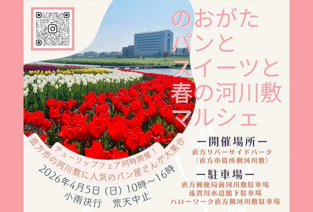 4月5日(日)、直方リバーサイドパークで「のおがたパンとスイーツと春の河川敷マルシェ」が開催されます。