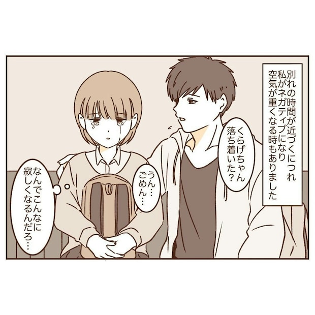 遠距離恋愛でのデートは楽しいことがたくさんありますが、別れの時間が近づくと、どうしても不安や寂しさがこみ上げてきます。また、そんな気持ちのときに街中で幸せそうなカップルを見かけると、くらげさんはつい羨ましく思ってしまいました。