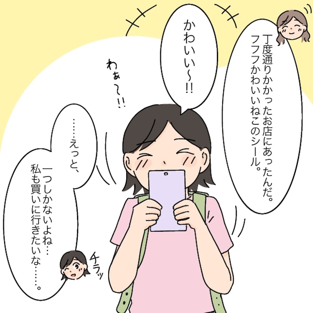 由依さんが「丁度通りかかったお店にあったんだ。フフフ。かわいいね、このシール」と言うと、「かわいい~!!わぁ~!!」と大興奮のあいちゃんは、少し落ち着いてから「・・えっと、一つしかないよね・・私も買いに行きたいな・・」とチラッと結衣さんを見ました。