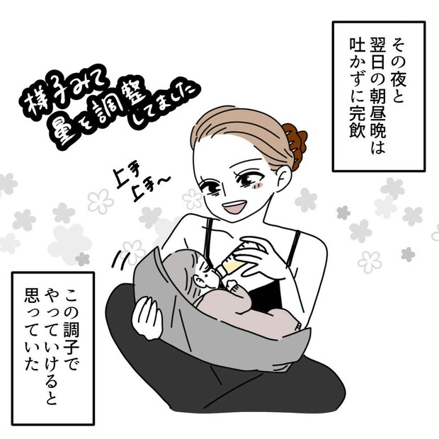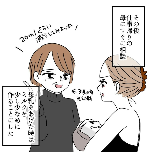 実母に相談できたタニシさんはアドバイスを受けました。赤ちゃんは自分で飲む量を調節できないため、あげればあげるだけ飲んで、満腹になったら吐いて調節するともいわれています。吐き戻しを減らすには、与える量を調節するしかありませんね。