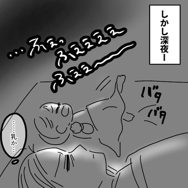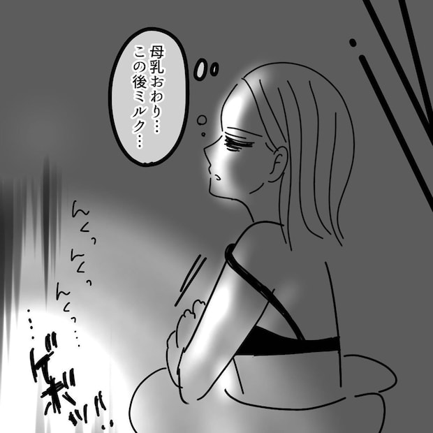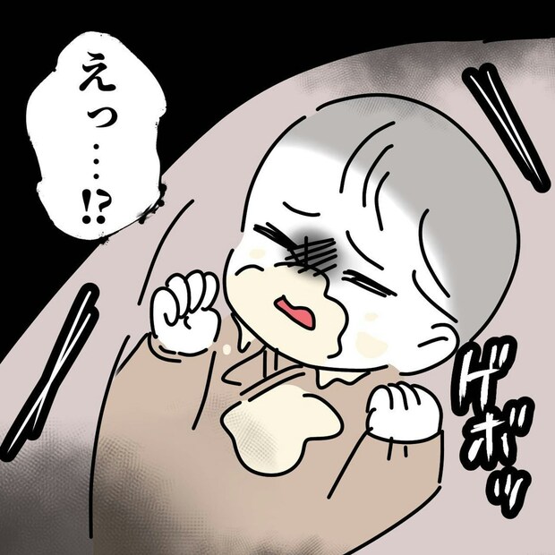 夜間授乳も少し慣れてきたころ、赤ちゃんにミルクを与えたあとゲップをさせようとすると、大量の吐き戻しをしてしまいました。初めての大量の吐き戻しに戸惑うタニシさんは、息子の様子に気づけなかったと自分を責めてしまうのでした。
