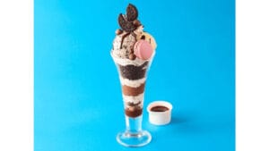 ビッグパフェとクレープには、甘酸っぱく爽やかな風味のカシスソースが付いています。カシスの爽やかな風味がクッキー&クリームの甘さを引き立て、すっきりとした味わいを堪能できます。
