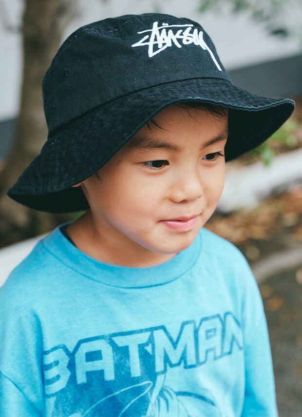 ブラックのバケットハットでストリートムードを満喫。鮮やかなブルーのプリントTシャツとのコントラストが絶妙!