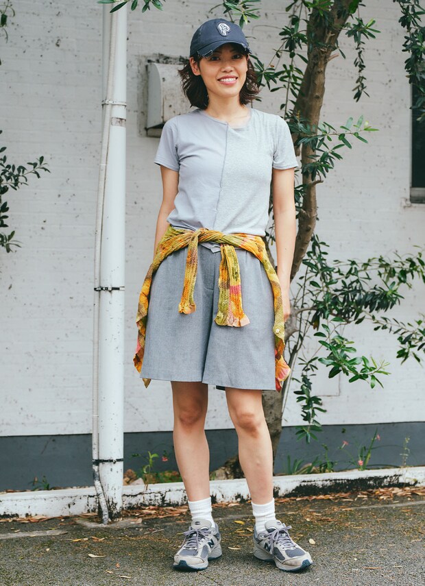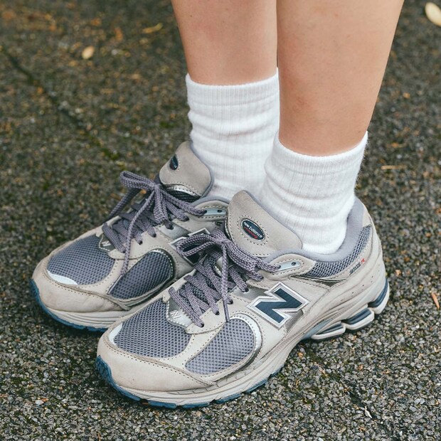 『ニューバランス』のグレー×ネイビーの配色が、コーデに奥行きを与えている。白ソックスでメリハリを出したのがグッド!