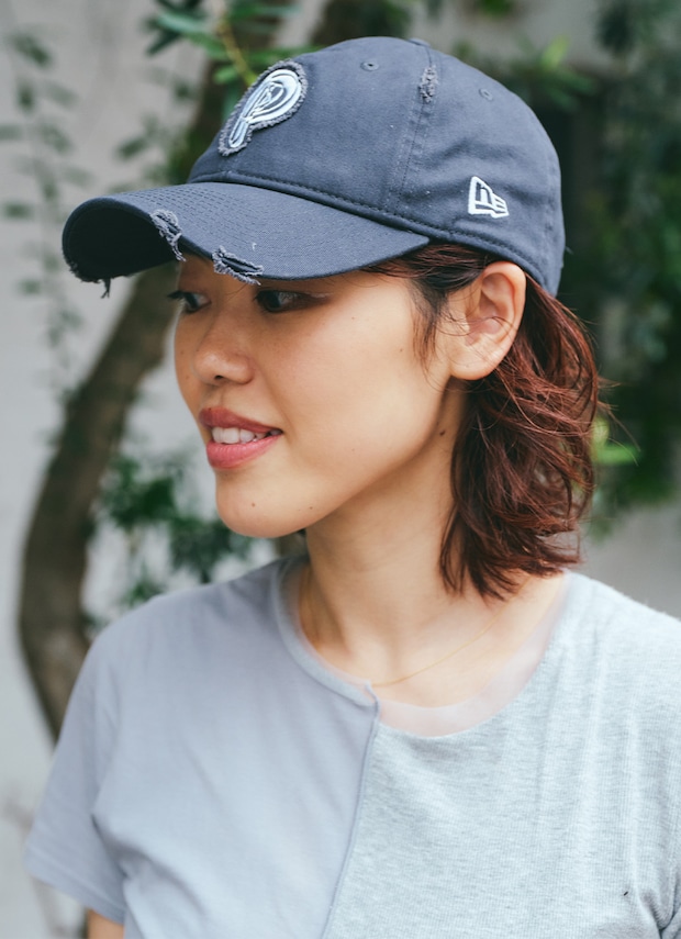 『パーバーズ』のネイビーキャップは、ヴィンテージ加工がこなれ感抜群! ワントーンコーデに、チラ見えするゴールドアクセサリーで華やかさを添えて。