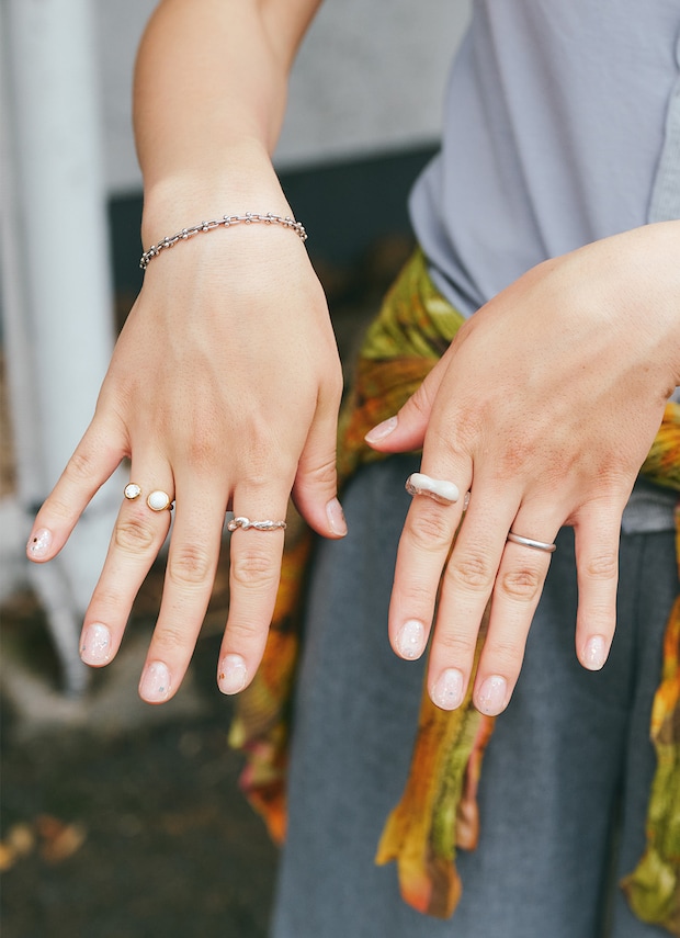 アクセサリーは上品なシルバーで統一。装いがカジュアルすぎないよう、小物でリッチにみせるのがサマ見えのコツ。