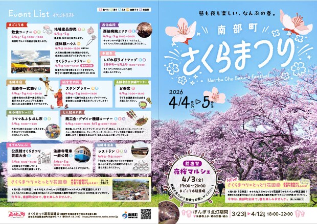 5.3㎞にわたる法隆寺川土手、城山公園の桜が一斉に咲き、花見にぴったりの時期に南部町全体で春を楽しむお祭りを開催します!当日は、飲食ブースやフリマ、古本市など盛り沢山!また、町指定の無形文化財法隆寺一式飾りのパフォーマンスやスタンプラリーもあります!3月23日から4月12日の夜は桜にぼんぼりが灯り、幻想的な雰囲気の中、川面にゆらぐ灯りで妖艶な桜景色が広がります!昼も夜も楽しいなんぶの春をお楽しみください!