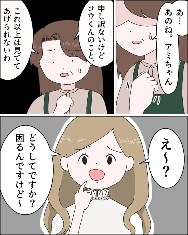 家事育児を当たり前のように押し付けるアミちゃんに我慢の限界がきた私は、「申し訳ないけど、コウくんのことこれ以上は見ててあげられないわ」と伝えました。すると、「どうしてですか?困るんですけど」と言われてしまいました。