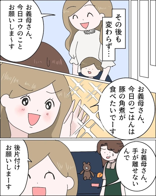 しかし、その後も息子夫婦の行動は変わりませんでした。コウくんのお世話を頼んだり、晩ごはんのメニューをリクエストしたり、部屋の後片付けを押し付けたり・・・。私の負担は減るばかりか増える一方です。