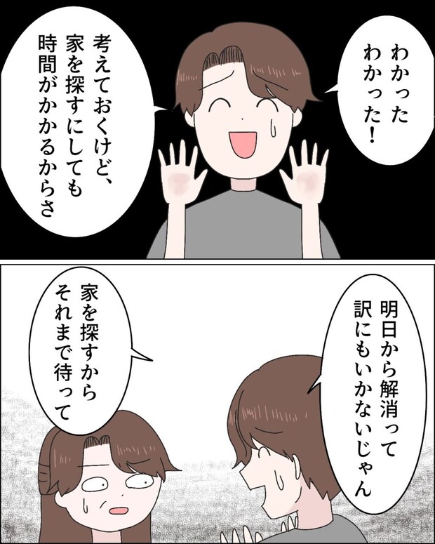 「わかったわかった」と言うショウですが、「考えておくけど、家を探すのにも時間がかかるから見つかるまで待ってほしい」と、どう見ても探している様子はないまま同居解消を先延ばしにされてしまいました。