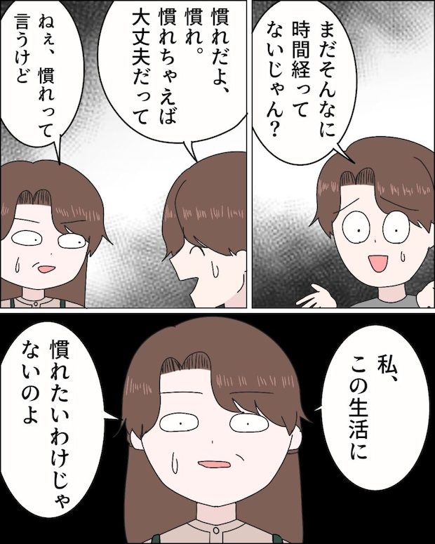 家事育児をすべて任せて自分たちの好きなように暮らす息子夫婦にモヤモヤが募り、同居解消を申し出た私に、「慣れちゃえば大丈夫」と見当違いな返答をするショウ。しかし、「この生活に慣れたいわけじゃない」と、正直な気持ちを伝えました。