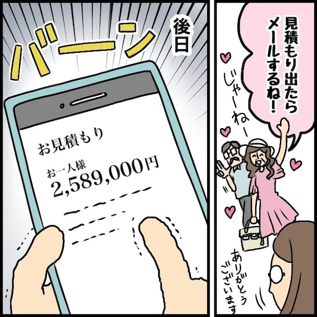 「見積もり出たらメールするね!」とご機嫌で帰って行った義母。そして後日、義母から送られてきたのは『お一人様2,589,000円』という想像をはるかに超えた見積もり金額で・・思わずスマホを持つ手が震えました。