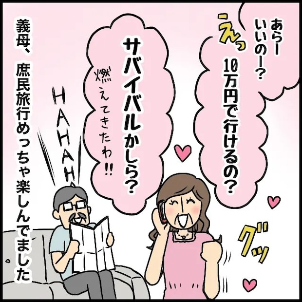 義母は、私の提案に嫌そうな素振りも全く見せず「あらーいいのー?」と喜んでくれ、おおまかな金額を伝えると「えっ!10万円で行けるの?サバイバルかしら?燃えてきたわ!!」と驚きつつもウキウキ。旅行のプランは私に任せてもらえることになり、結果、義母は庶民旅行をめちゃくちゃ楽しんでいました。庶民旅行はお嬢様な義母にとっては不便なこともたくさんあったはずですが、好奇心旺盛な義母は逆にそれが新鮮だったようで楽しんでくれ、とても喜んでくれました。お義母さん、次の旅行も私プロデュースでいいですか?