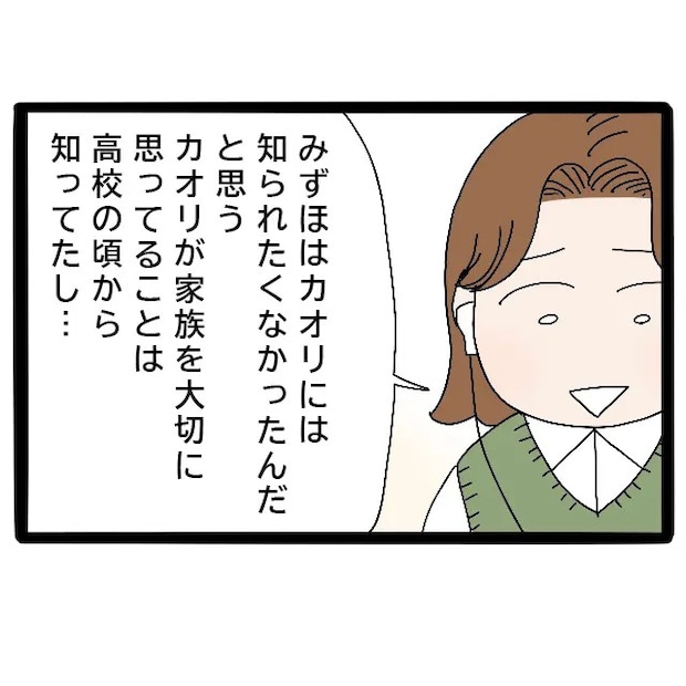 「私、自分の家のことなのに全然知らなかった」そうショックを受ける私に、よっちゃんは「みずほはカオリには知られたくなかったんだと思う、カオリが家族を大切に思ってることは高校の頃から知ってたし・・・」と優しく声をかけてくれました。