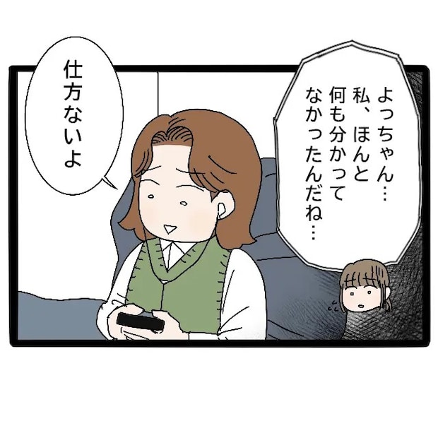 「よっちゃん・・・私、ほんと何も分かってなかったんだね」そうつぶやくと、よっちゃんは静かに「仕方ないよ」と言ってくれました。
