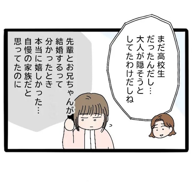 「まだ高校生だったんだし、大人が隠そうとしてたわけだしね」よっちゃんはそう言って、私の気持ちをそっとフォローしてくれました。先輩と兄が結婚すると知ったとき、本当に嬉しかった。自慢の家族だと思っていたのに・・・どうしてこんなことになってしまったのでしょうか。