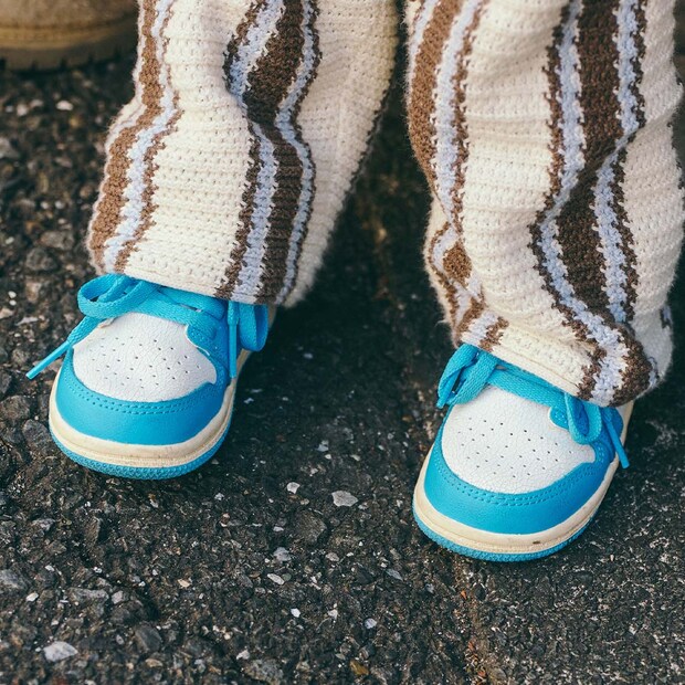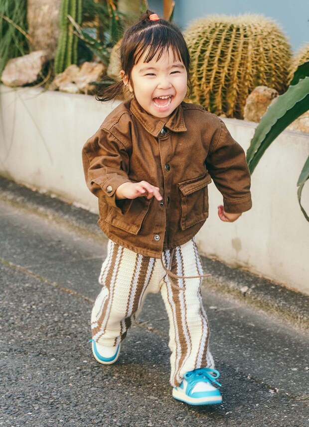 鮮やかなブルーラインのスニーカーで足元から元気をチャージ! ママとカラーをシェアして親子リンクコーデの出来上がり♪