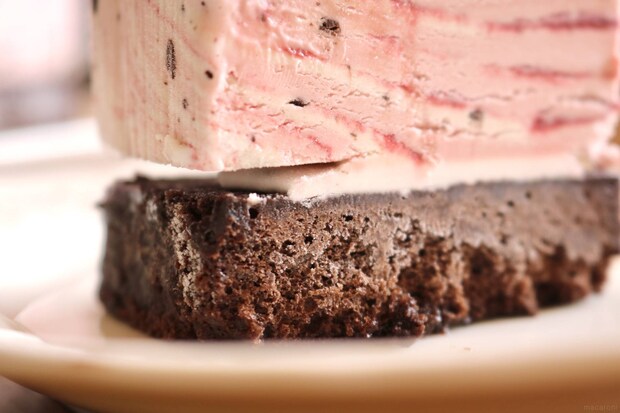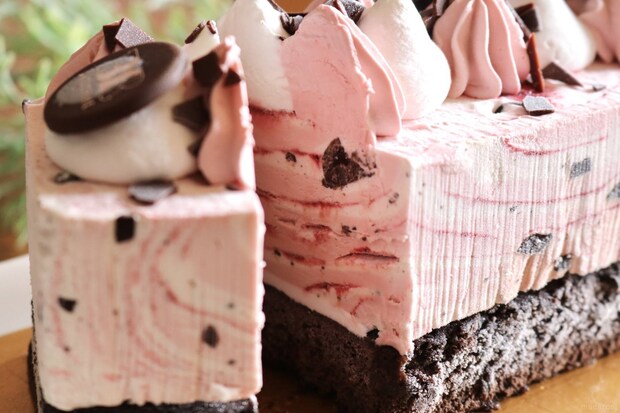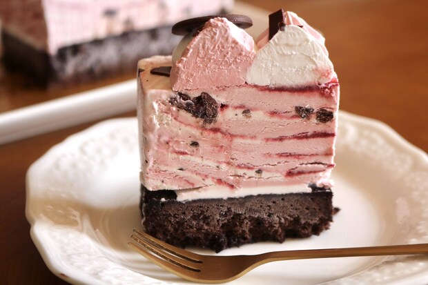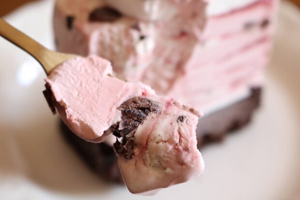 カリッとしたラズベリー入りチョコの食感もアクセントになっていて、食べていると思わず笑顔になってしまうアイスクリームケーキです。