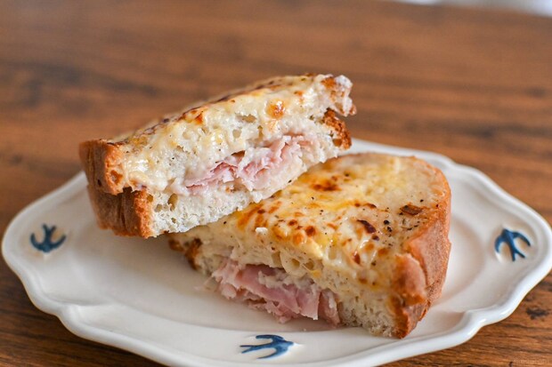 おすすめの温め方を参考にリベイク。表面がカリッと香ばしく、とろ~っととろけるチーズと香りに食欲をそそられます。ふんわりとしたカンパーニュとともに、シュゼットハムの旨みとなめらかで濃厚なベシャメルソースを味わえますよ。
