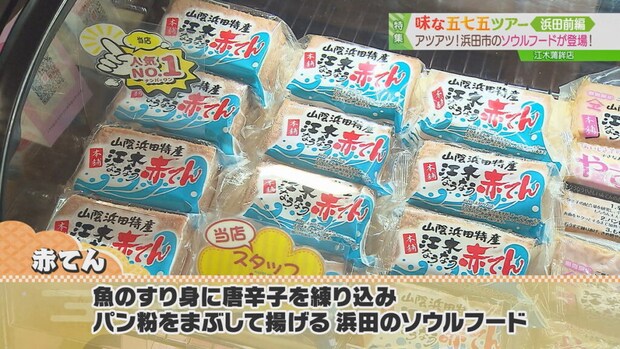 赤てんとは、魚のすり身に唐辛子を練り込み、パン粉にまぶしてあげる浜田のソウルフード!