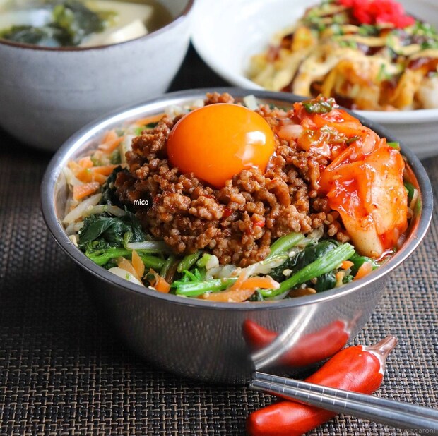 電子レンジを活用すれば、ビビンバが簡単に作れます。ご飯に肉と野菜のナムルをたっぷりのせれば、彩り豊かで栄養も十分。コチュジャンの甘辛いたれが、食欲を刺激します。しっかりとした食べ応えで、満足感がありますよ。