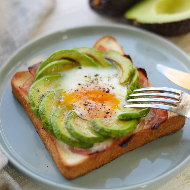 とろける卵と濃厚なアボカドが相性抜群の、見た目も華やかなカフェ風メニュー。スライスしたアボカドの中心に卵を落とし、トースターで焼くだけと簡単です。香ばしいトーストに具材が絡み、リッチな気分を味わえますよ。