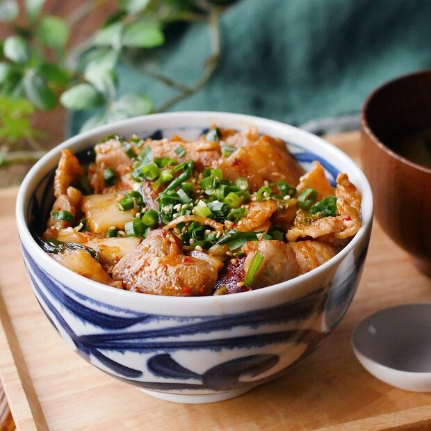 旨辛いキムチとジューシーな豚肉が絡み合う、食欲をそそる豚キムチ丼。サッと炒めてご飯にのせるだけで、手軽に完成します。仕上げに温玉をのせれば、コクが加わり、まろやかな味わいを楽しめます。忙しい日でも満足感のあるひと品として活躍してくれます。