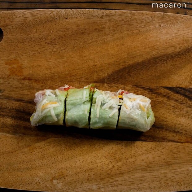 ライスペーパーの上にレタスを敷き、①、トマト、ミックスチーズをのせて手前から巻きます。4等分に切って完成です。