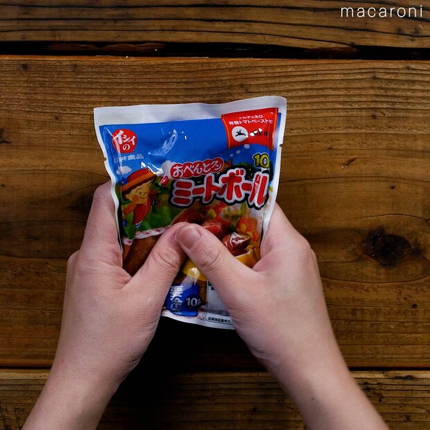 ミートボールは袋の上から潰してミンチ状にします。