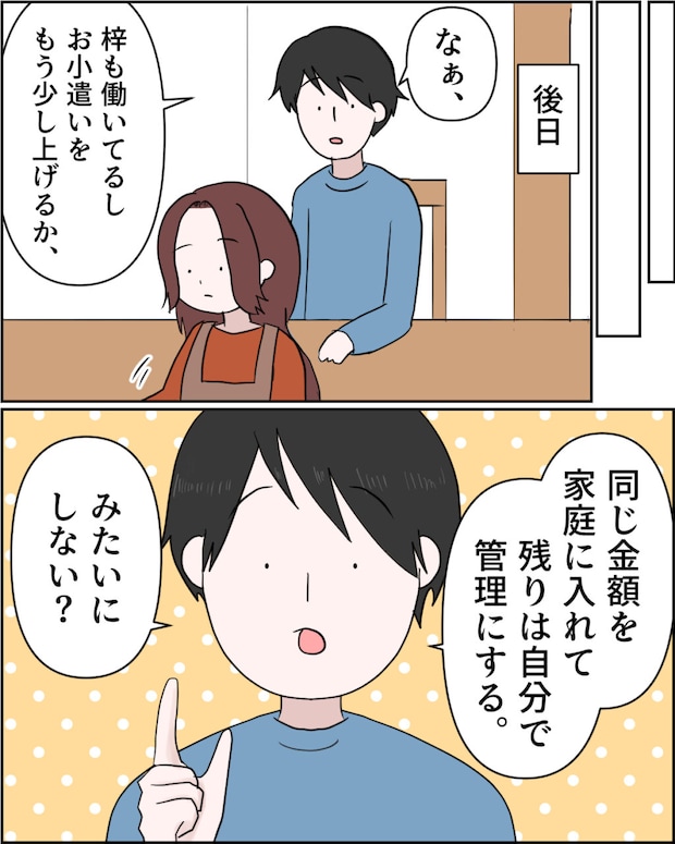 「なぁ、梓も働いてるしお小遣いをもう少し上げるか、同じ金額を家庭に入れて残りは自分で管理する、みたいにしない?」と謙介が突然言い出しました。