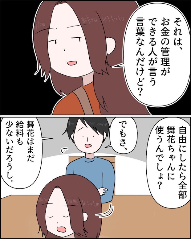 「それは、お金の管理ができる人が言う言葉なんだけど?自由にしたら全部舞香ちゃんに使うんでしょ?」私がそう言うと、「でもさ、舞香はまだ給料も少ないだろうし」と言い出す謙介。