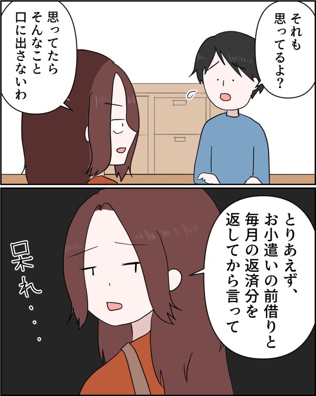 「それも思ってるよ」謙介はそう言うものの、「思ってたらそんなこと口に出さないわ」と即答した私は、「とりあえず、お小遣いの前借りと毎月の返済分を返してから言って」と呆れながら謙介に伝えたのでした。