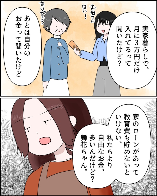 「実家暮らしで月に3万円だけ家に入れてるって聞いたけど?あとは自分のお金って聞いたから、家のローンがあって、教育費も貯めないといけない、私たちより自由なお金、多いんだけど?舞香ちゃん」と、実際舞香ちゃんは自由に使っているんだろうと思いながらそう言うと、