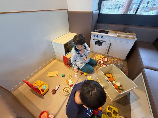 1歳の長女にはメニューにあったのでレトルト離乳食を(レンジ温め可)頼んでみました。便利ですよね。また注文した料理が来るまでの間、上の子たちは併設のキッズスペースで遊びながら待つことができたのも良かったです。食後には人気の門司港プリンも食べて大満足!ちなみに、このプリンはオンラインでも買えます!