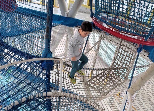 おいしいランチでお腹を満たしたあとは、ミルクホールから徒歩約10分ほどのところにある「関門海峡ミュージアム」へ。 海峡こども広場は、1人100円で利用できるスロープネットの遊具空間が広がります。週末は40分の時間制利用なので短いように感じましたが遊んでみると結構しっかり遊べます。寒い日に行ったというのに長男、次男は汗だく!私も久しぶりに全身を使って動いたのでヘロヘロになりました(笑)。利用する際は運動靴着用でしか入場できないのでご注意を。携帯電話や帽子、アクセサリー類は持ち込み不可なので、身軽な服装がおすすめです!