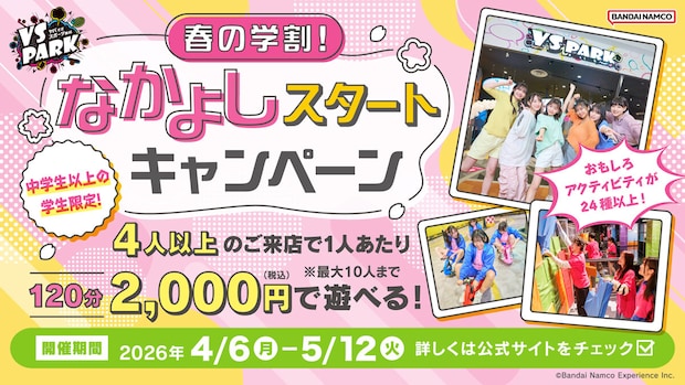 期間中は、中学生以上の学生4人以上のグループなら1人2,000円で遊べる「春の学割!なかよしスタートキャンペーン」と、小学生と大人のペアで1人あたり500円引きになる「春の親子でおでかけキャンペーン」を実施します。いずれも120分料金が対象で、3月24日からWEBチケットの先行販売も開始しました。