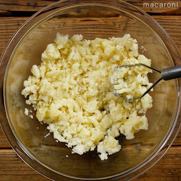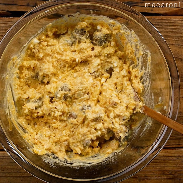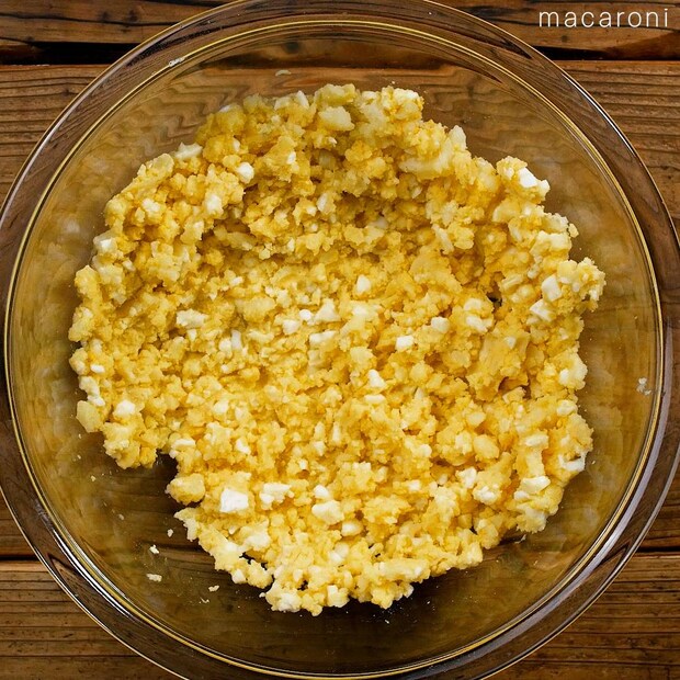 じゃがいもは皮をむいて、つぶします。ゆで卵を加えてさらにつぶします。