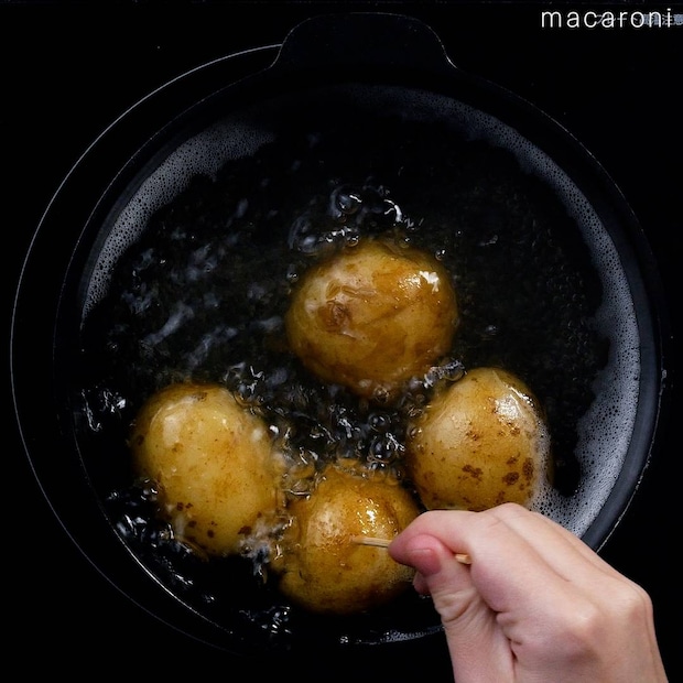 新じゃがいもは水から加熱し、串がスッと通るまでゆでます。