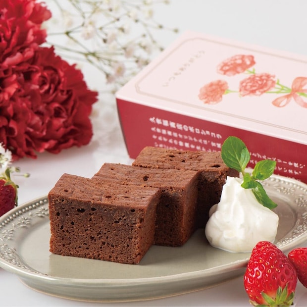 濃厚なチョコに、宮城県産いちごとブルーベリーの華やかな香りを重ねた常温のチョコレートケーキ。「いつもありがとう」のメッセージとカーネーションをあしらった母の日限定パッケージ。
