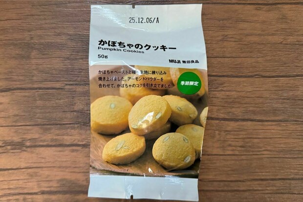袋から取り出すと、かぼちゃの風味が感じられて食欲をそそります!丸い可愛らしいクッキーの表面には、ピスタチオが埋め込まれています。