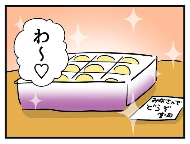 職場におみやげを買ってきてくれた同僚。こういうときは大体多めに買ってきますよね。