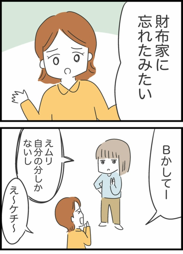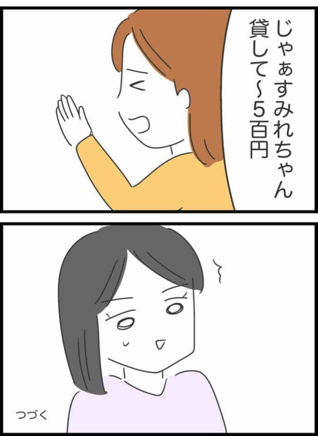 Cちゃんは「財布を忘れてきたから500円を貸してほしい」と言い出します。Bちゃんにお願いするも断られ、今度はすみれにお願いしてきました。昨日あんなことがあってもまだ懲りずにお金を借りようとするなんて信じられませんよね…。お金の怖さを知ってしまったすみれははっきりと断ることができるのでしょうか…。
