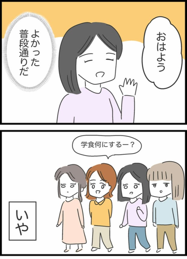 AちゃんとCちゃんがやり合った翌日、Cちゃんがいつもと変わらない様子であいさつしてきたことにホッとしたすみれ。しかし、すぐにAちゃんにだけ話しかけていないことに気づいてしまいます。さらに、学食に行くのに「財布を忘れてきたから500円を貸してほしい」と言い、Bちゃんに断られると今度はすみれにお願いしてきたのです。