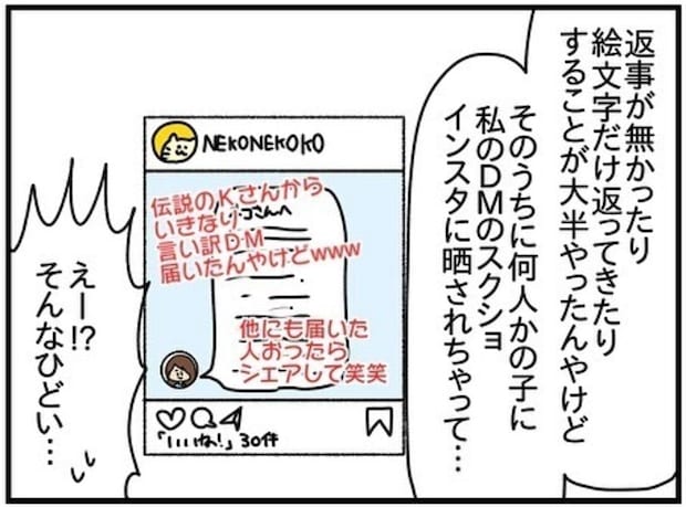 以前、きよかさんがネイルの写真をSNSに投稿したところ、大学時代の友人・チコちゃんからしつこく「練習台になってあげる」と、言われます。友人づてに解決策を探っていたところ、チコちゃんのSNSが消えます。