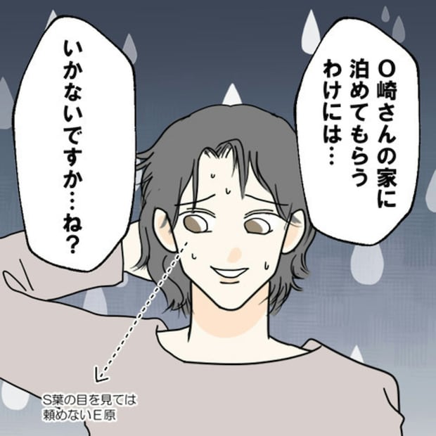 E原さんが困っていると思い家にあげたのに、「泊まらせてほしい」という言葉に嫌な想像が止まらないS葉さん。E原さんは本当に彼女が想像するような人物なのでしょうか。