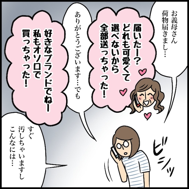 お礼を伝えようと電話をかけると、「お義母さん荷物届きまし・・」と私が言い終わらないうちに「届いたー?どれも可愛くて選べないから全部送っちゃった!」と嬉しそうに話す義母。「ありがとうございます・・でも」と言いかけると「好きなブランドでねー、私もオソロで買っちゃった!」とあまり私の話しが耳に入っていない様子の義母に、意を決して「すぐ汚しちゃいますし、こんなには・・」と多すぎる贈り物をビシッと遠慮した私。義母の気持ちはとてもありがたいけれど、すぐに着れなくなってしまうしたくさん汚してしまうので、こんな高級なベビー服はもったいないと思ってしまう庶民の私。
