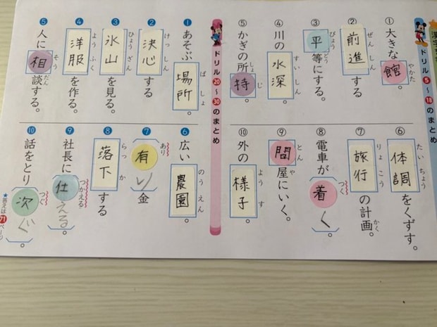 3:ドリルのテスト式の穴埋め問題ではシールを使用して選択式に。最初は述語ずつシールで書いてたのですが、それだと今の娘には簡単そうで、1文字1文字の漢字の選択式に変えました。同じシールの選択式でも、今の娘にちょっとだけ難しいが大事だと思ってるので、そこを毎回探って、簡単そうなら変えていくのを繰り返しています」