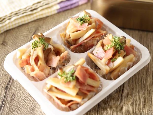 お弁当カップに入れやすいサイズに切って炒めるだけの簡単副菜です。きのことベーコンは、間違いないおいしさですよ。