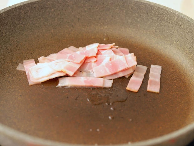 2. フライパンにオリーブオイル、ベーコンを入れ、中火にかける。