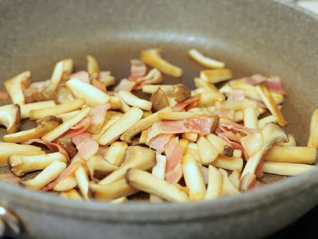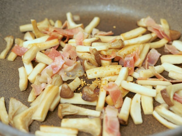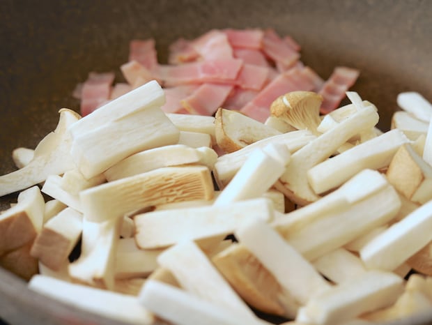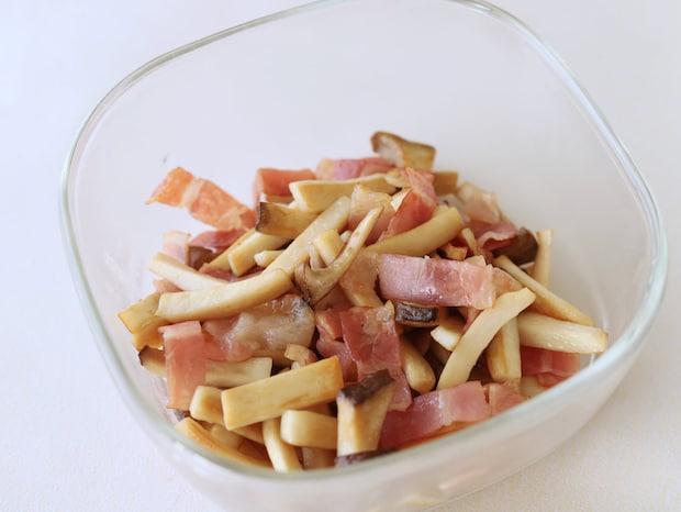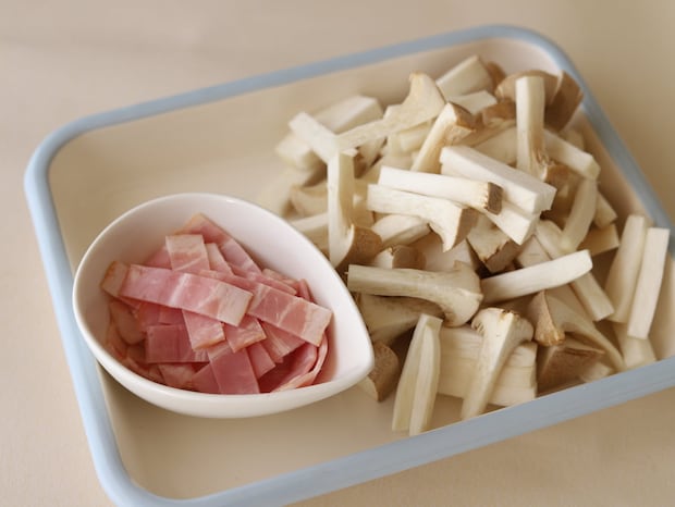 1.エリンギは5mm角、長さ3cmに切る。ベーコンは1cm幅に切る。
